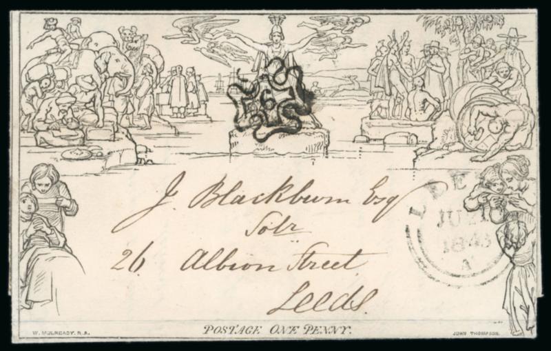 1843 (Jun 23) 1d Mulready lettersheet, stereo A54, sent from London to Leeds with London number "6" in Maltese cross, Leeds arrival adjacent, light horizontal folds, a very fine and attractive usage of the London numbered MC (S.G. Spec. from £2'250).