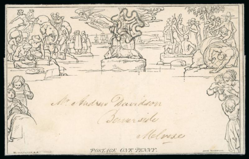 1882 (Dec 24) A stunning hand painted 1d. Mulready design by E. Leech RA, bearing 1d. lilac (defective at foot), not detracting from the very fine appearance. Ex Grunin.