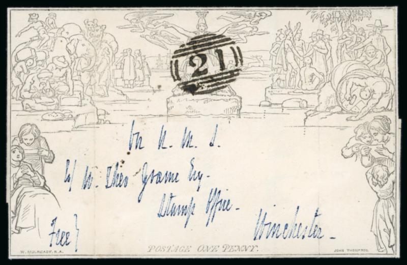 1845 (Nov 15) 1d Mulready lettersheet, stereo A10 forme 1, endorsed "O.H.M.S." and sent from Andover to the Stamp Office in Winchester (Hampshire), cancelled by superb strike of 1844-type "21" numeral, reverse with despatch and arrival ds, with message inside in the same blue ink requesting legal fo