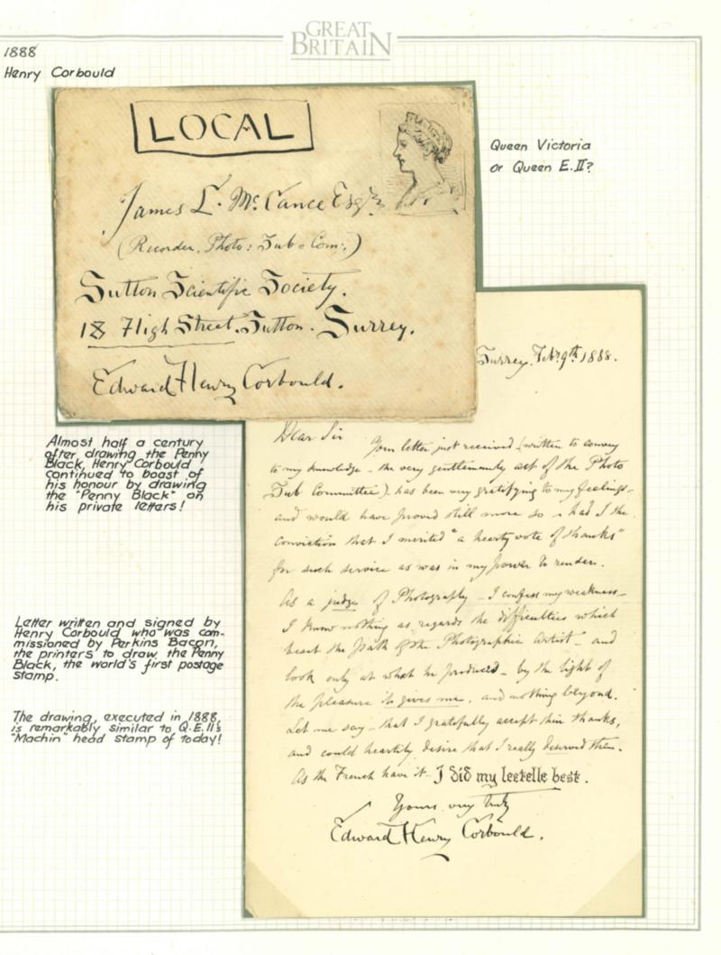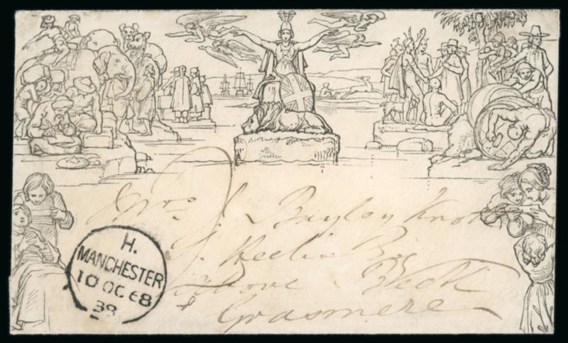 1864-68 pair of hand illustrated envelope and front with contents from the correspondence of Edward Henry Corbould, artist and son of Henry Corbould (who's sketch of the Wyon city medal was used for the Penny Black). Edward similarly followed his fathers footsteps and produced the "Britannia" design