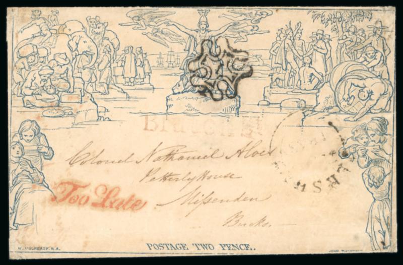 1843 (Jun 20) 2d Mulready envelope, stereo a195, from London to Buckinghamshire, cancelled by London number "1" in MC with "Bruton St" s/l hs below along with cursive "Too Late" hs and Amersham arrival, reverse with London despatch and complete eax seal for the Oriental Translation Committee, fine a