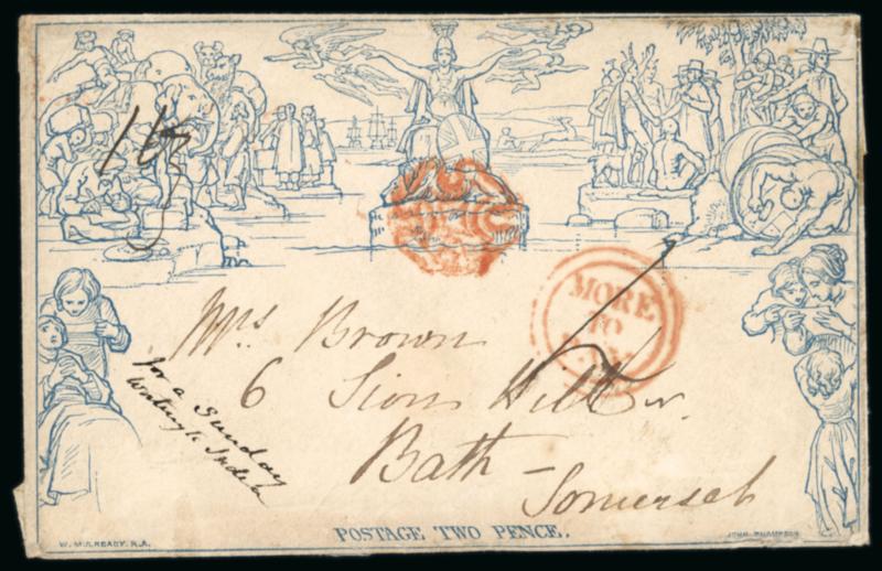 1840 (Sep 22) 2d Mulready envelope, stereo a202, sent from London to Bath, underpaid with "MORE / TO PAY" double circle hs and ms "4" for double the deficiency, , reverse with despatch hs, minor soiling, fine and rare postage due on a 2d Mulready; ex "Mayflower".