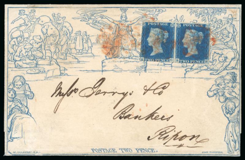 1841 (Jan 5) 2d Mulready lettersheet sent from Richmond to Ripon (Yorkshire) uprated with 1840 2d blue pair (one stamp cut into on two sides), tied by slightly smudgy strikes of a red MC, reverse with despatch cds, very fine and rare uprated 2d Mulready, the only example we have seen of a 2d Mulread