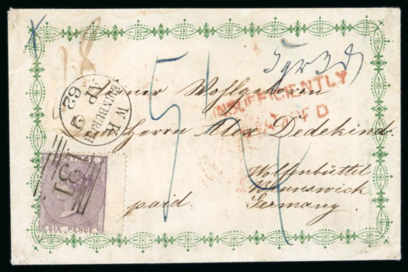 1862 (Apr 2) superb green printed "Ladies Envelope" from Edinburgh to Germany, bearing 6d. lilac neatly tied by "131" numeral cancels; a very attractive envelope and very rare so fine.