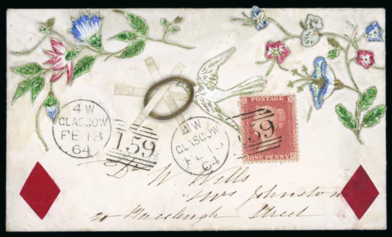 1864 (Feb 13) a stunning valentines envelope used locally in Glasgow, with applied flowers and foliage and a brass ring "delivered" by a dove, bearing 1d. red, neatly tied by duplex numeral cancel, also original lace enclosure, depicting prospective hand, quite spectacular and easily one of the fine
