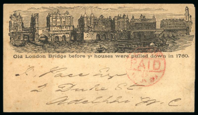 1881 (Jul 18) a superb example of the "London Bridge" wrapper, neatly cancelled by red "PAID" c.d.s.; a major rarity and the finest of the three recorded examples.