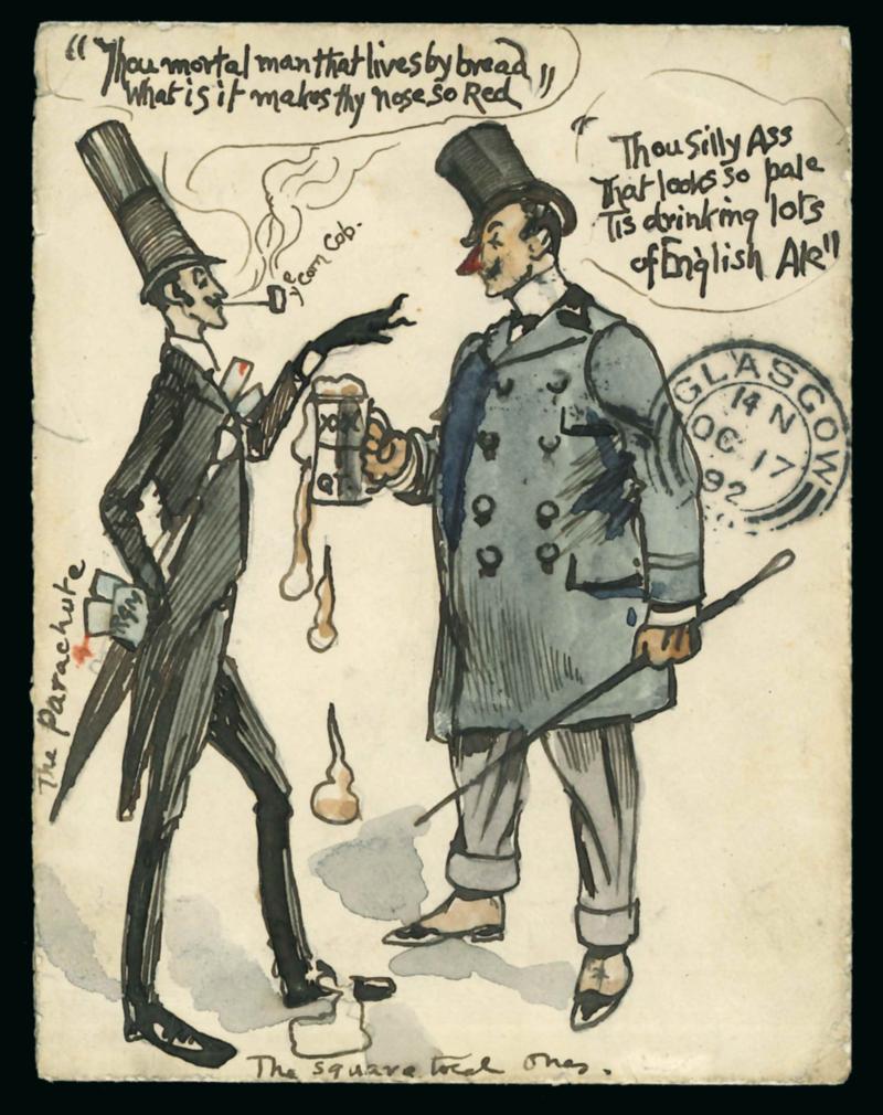1892 (Oct 17) hand painted envelope from Birmingham to Glasgow, bearing 1881 1d lilac, the stamp placed on reverse (as per written request by the sender) across the flap (not torn) and the front depicting a well executed hand coloured drawing of two well dressed Victorian gentlemen, with an addition
