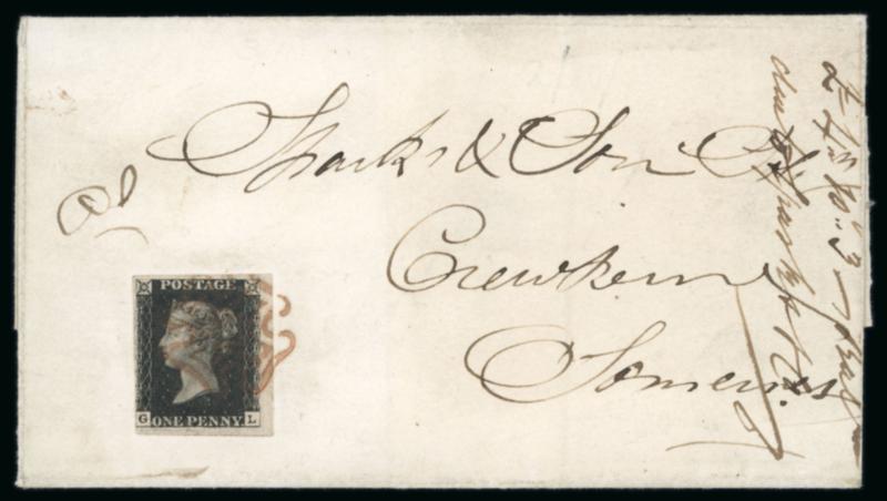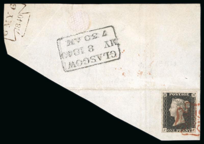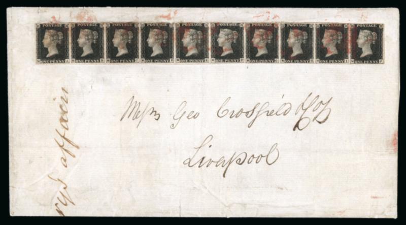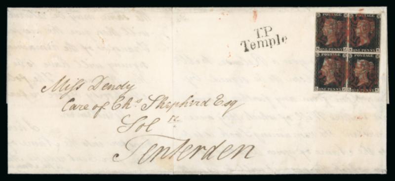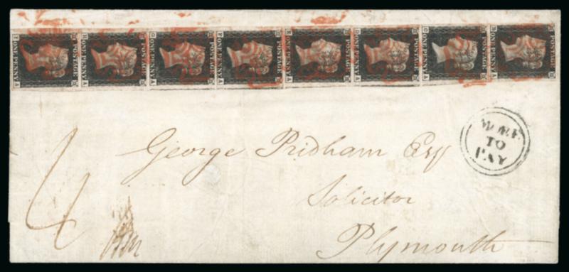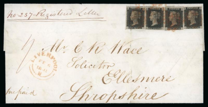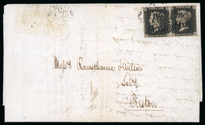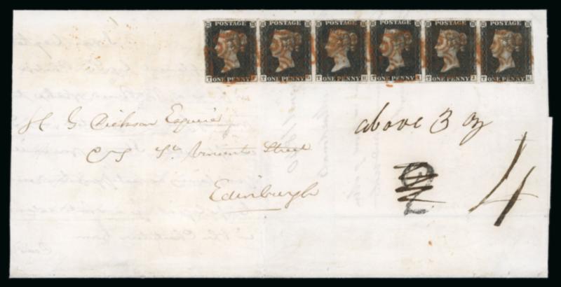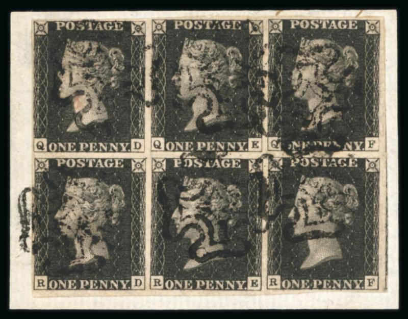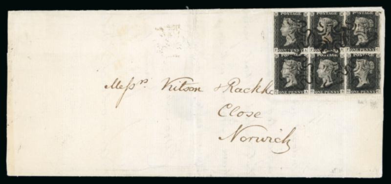 1840 (May 9) entire to Manchester bearing a superb 1840 1d black pl.1a MH-NJ block of six, with good margins all round, neatly tied by good strikes of orange-red MCs, endorsed ‘’under 3 ozs’’ and with ‘’Chester MY 9 1840’’ arrival strike. A remarkable and important multiple use of the 1d black with