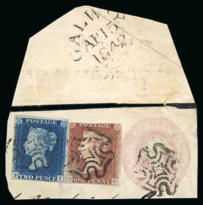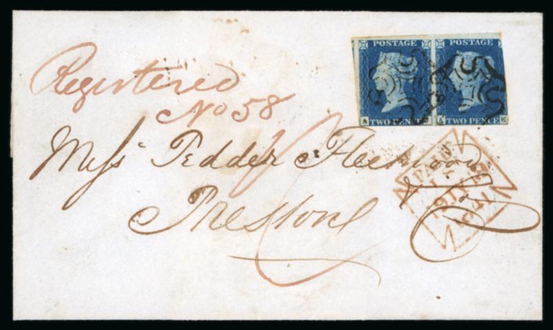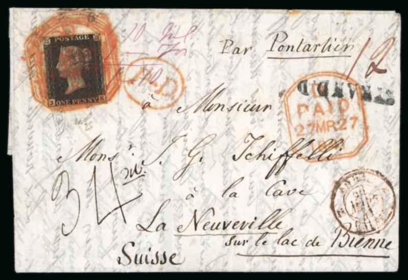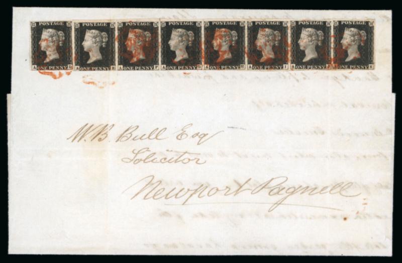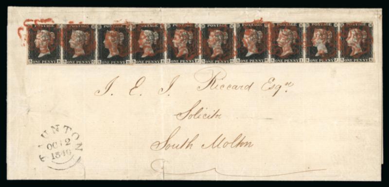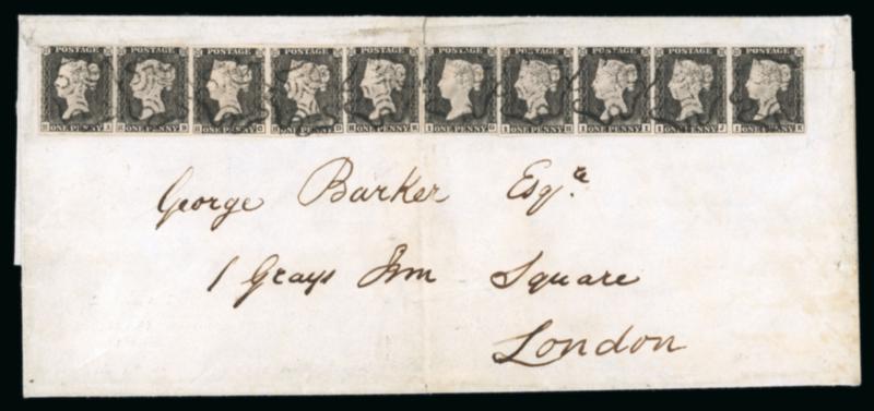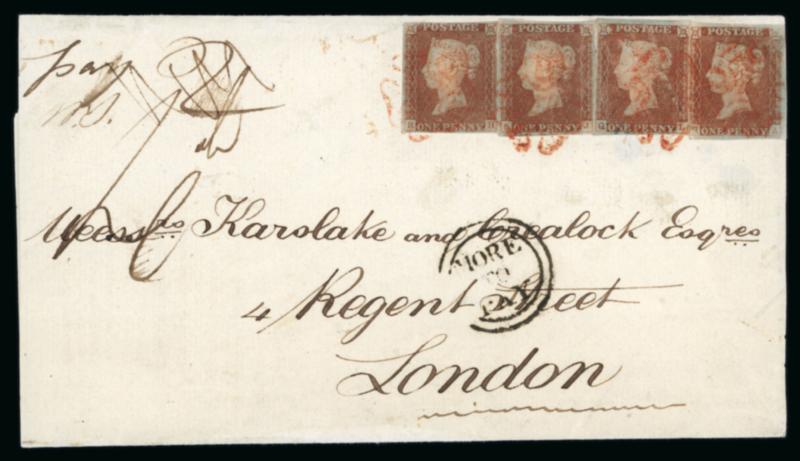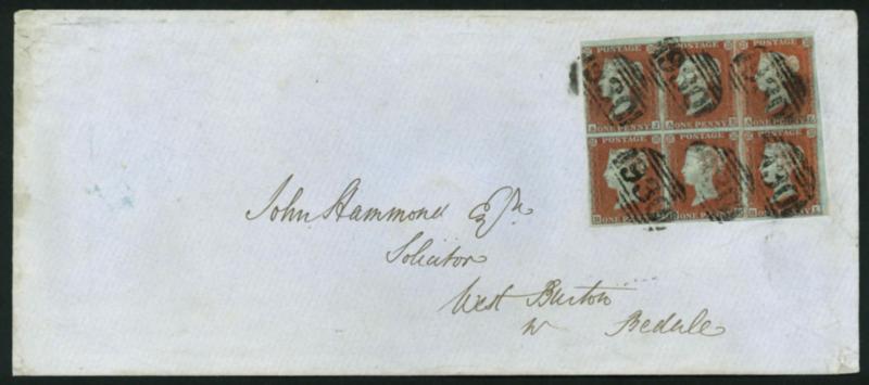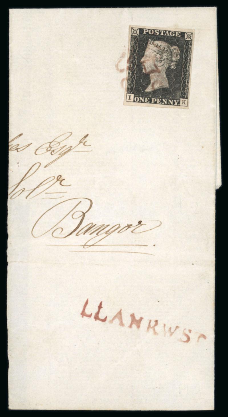 1840 (May 9) entire to Manchester bearing a superb 1840 1d black pl.1a MH-NJ block of six, with good margins all round, neatly tied by good strikes of orange-red MCs, endorsed ‘’under 3 ozs’’ and with ‘’Chester MY 9 1840’’ arrival strike. A remarkable and important multiple use of the 1d black with