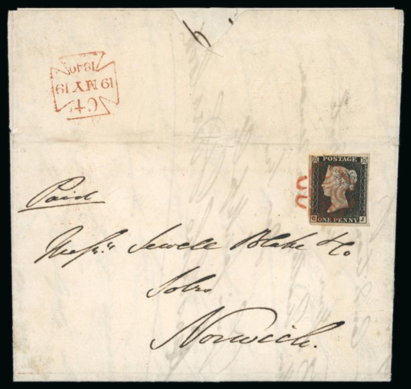 1840 (May 19) entire from London to Norwich with 1840 1d black pl.1a CJ, touched on the top left, tied by neat red Maltese cross, reverse with crisp Charing Cross despatch, a fine May Date example (S.G. from £2'500).