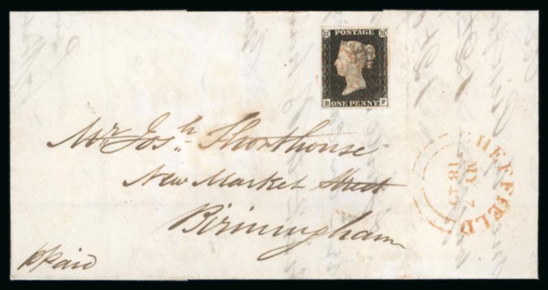 1840 1d black pl.1a BF, close to good margins, used on entire letter from Sheffield to Birmingham, dated My 7. 1840 the second day of issue, neatly cancelled by red Maltese cross with the side flap refolded to perfectly display the fine Sheffield ds; a lovely second day usage cover; cert. Eichele (2