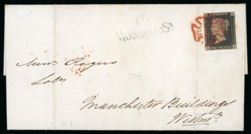 1840 1d. black, AA, Pl. 2, close to good margins, used on entire dated 14 May 1840, neatly cancelled by a superb strike of the red Maltese cross, a scarce May Date usage.
