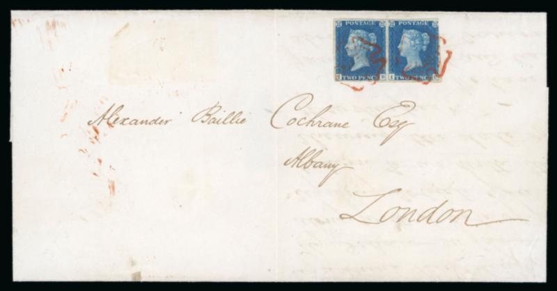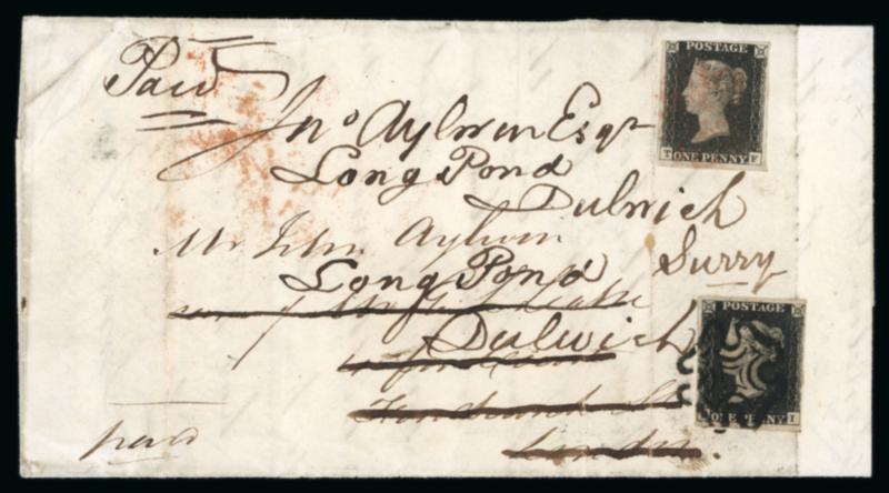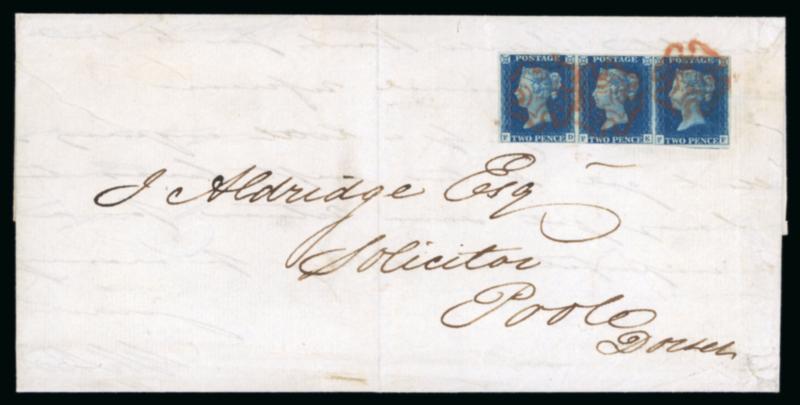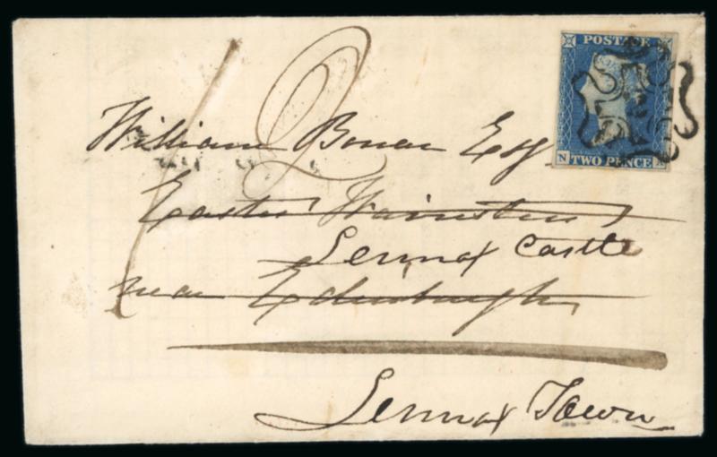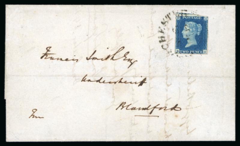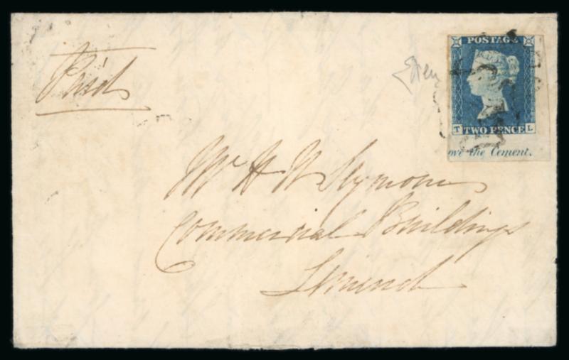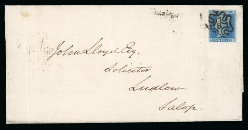 1844 (Mar 15) entire from London to Ludlow, bearing 1841 2d. blue, QG, Pl.3, with good margins all round, neatly cancelled by a good part strike of the "8" in black Maltese Cross; attractive and very scarce.