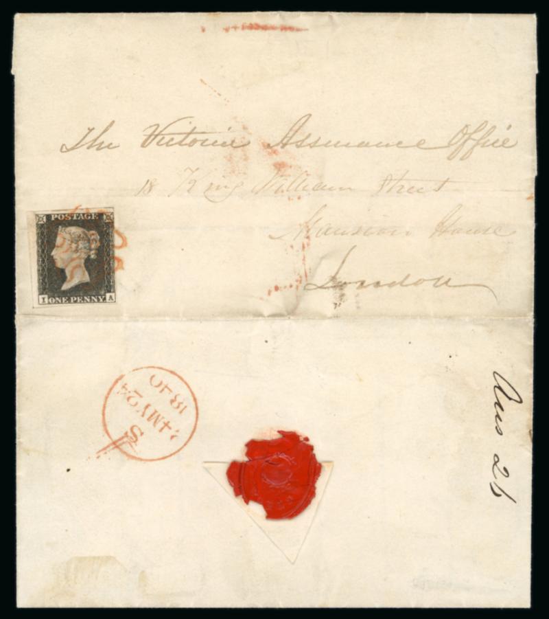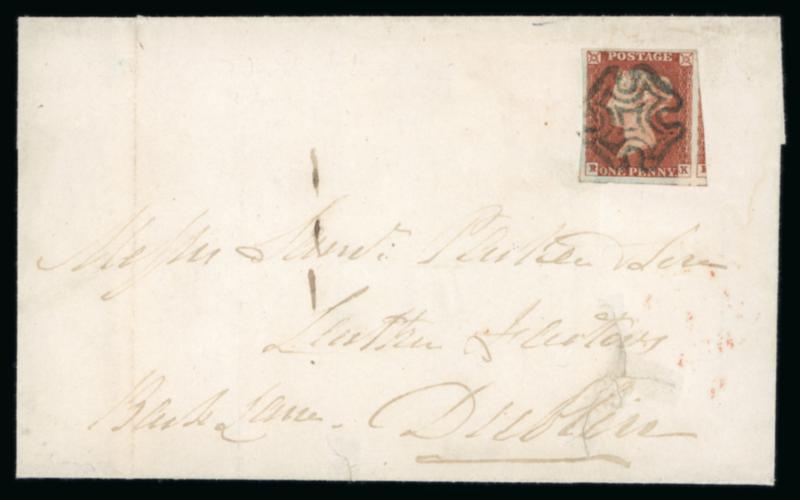 1840 (May 24 used on the 3rd Sunday) entire letter from Dublin to London, bearing 1840 1d black pl.1a IA, with good to enormous margins placed at the lower left contrary to regulations , neatly cancelled by red Maltese cross; fine and attractive. A rare 3rd Sunday usage demonstrating that there was