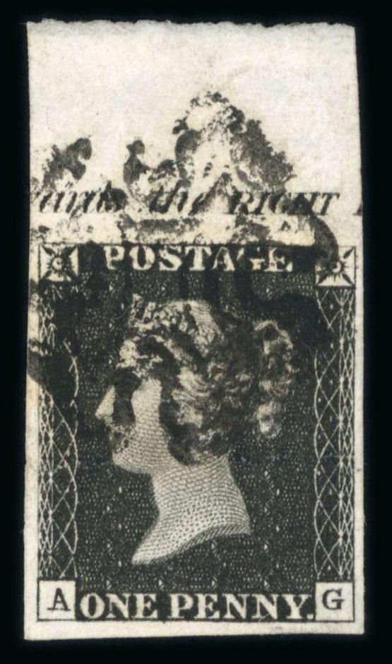 1840 1d black pl.1a HL, huge margins all round, watermark inverted, neatly cancelled by a fine strike of the red Maltese cross. one of the finest examples extant of this very rare watermark variety; cert BPA (1951).