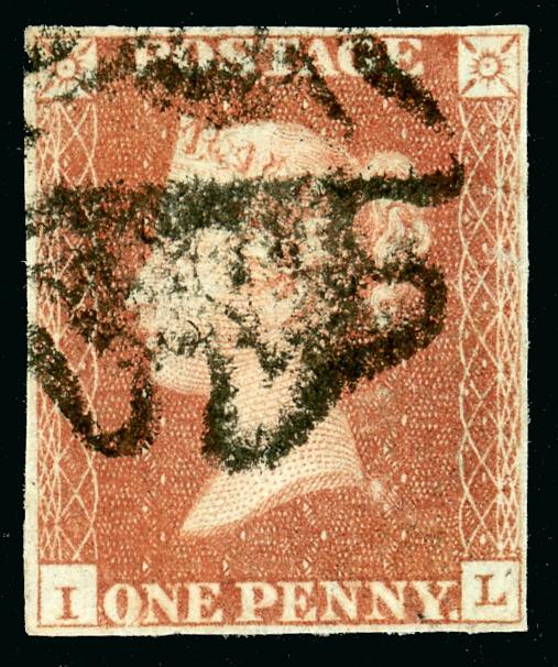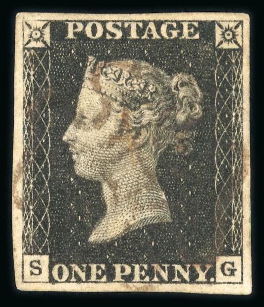 1840 1d black pl.1b CH with 4 large margins, neat strike of red MC, a very fine and most attractive example.
