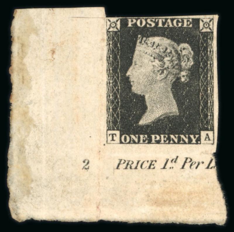 1840 1d black pl.1a TC mint marginal example from the foot of the sheet with full deckle edge, having a pre printing paper crease and showing part Inscription "of 12. £1... Per", large part original gum, a fine and very rare example.