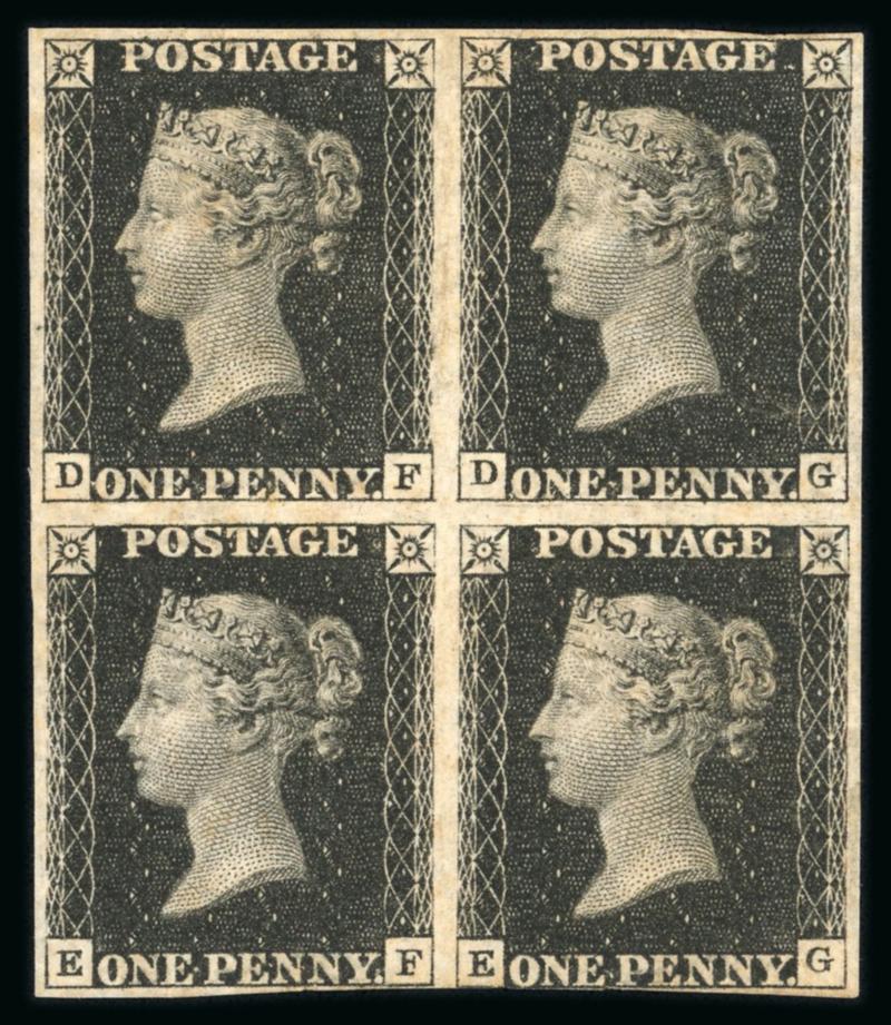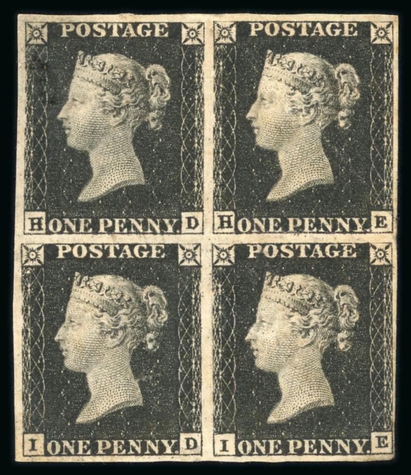 1840 1d black pl.1b range of 67 examples on Hagner, all have 4 margins, most are fine, and each has a different check letter (between AA and TJ), a very useful and substantial accumulation.