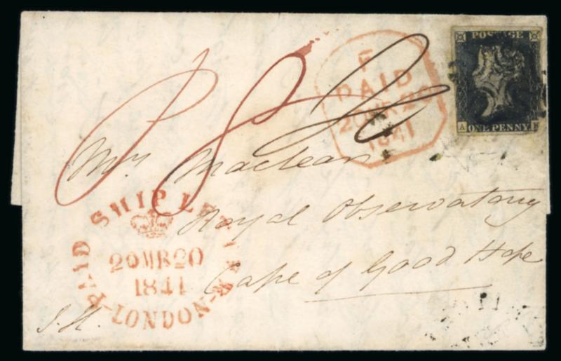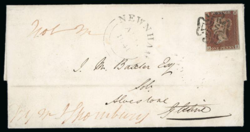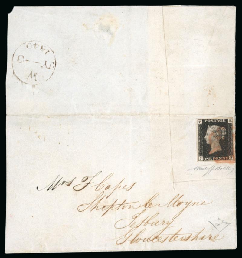 1841 (AU 27) entire missent to Gloucester, bearing 1841 1d. red-brown, JI, Pl.14, with good margins all round (a little close at upper left corner), tied by the very rare distinctive WOTTON UNDER EDGE, Maltese cross in black with d.s on reverse; a major rarity.