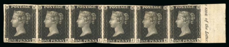 1840 1d black pl.1b in horizontal strip of 6 CA - CF with clear margins all round and 6 strikes of black MC. A small scissor cut to upper right of CD, otherwise fine and a most striking and very scarce multiple.