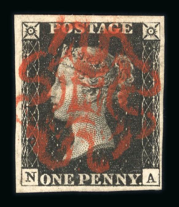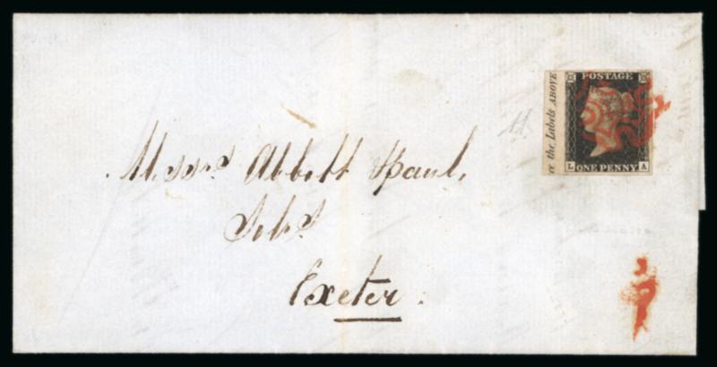 1840 1d black pl.1a NC with 4 clear to large margins and lightly struck red MC, worn impression, a fine and most attractive example.