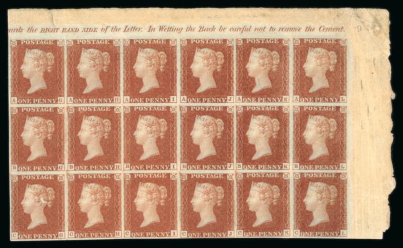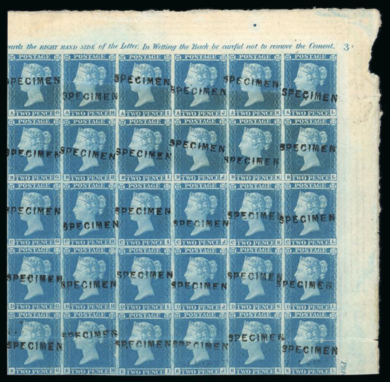 1841 2d blue pl.3 AG/KL mint marginal inscriptional block of 30 from the upper left of the sheet with full deckle edge on two sides showing part inscription "ards the RIGHT HAND SIDE of The Letter. In Wetting the Back be careful not to remove the Cement" and additionally showing the plate number "3