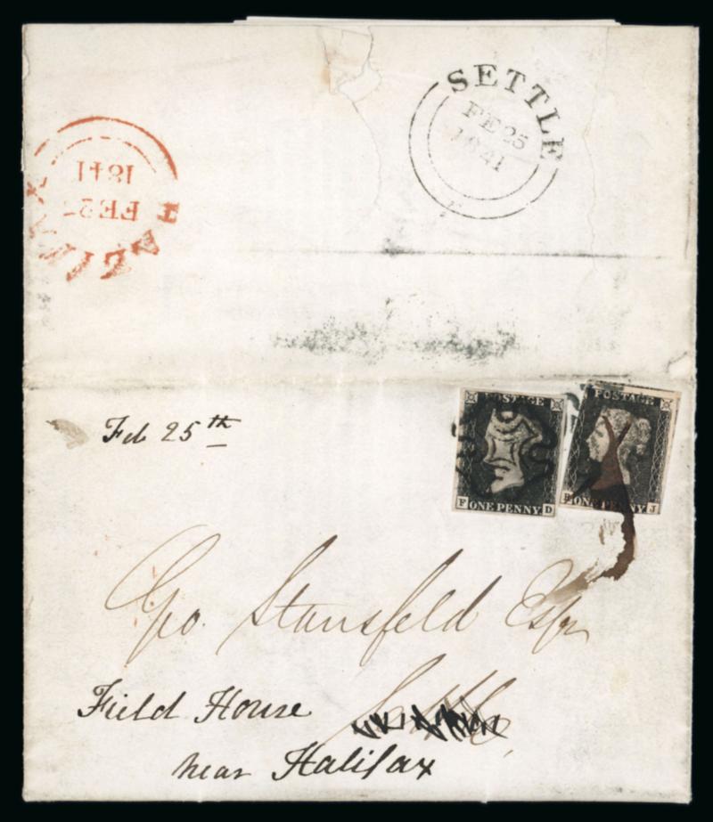 Settle: 1841 1d red-brown on with four margins on cover to Edinburgh tied fine strike in black of the Settle (Yorkshire) distinctive MC, departure strike in blue on reverse, a fine and scarce cover; cert. Brandon (2006) (S.G. Spec B1tad, £1'500).