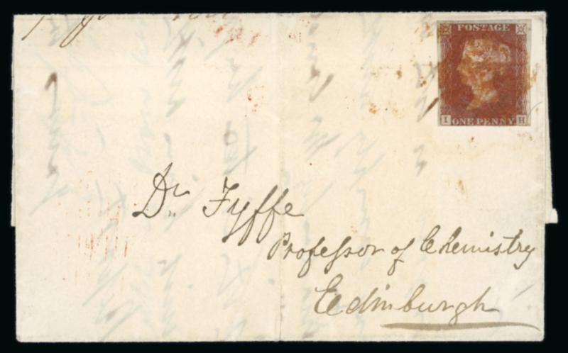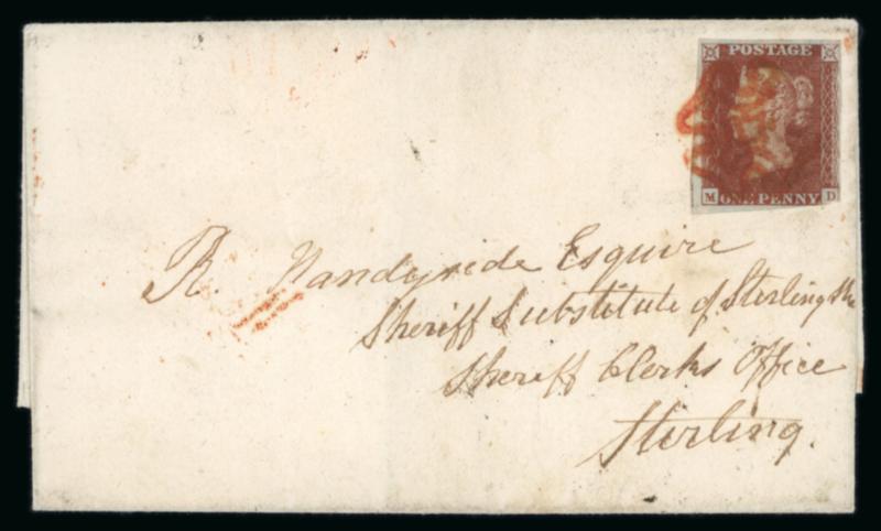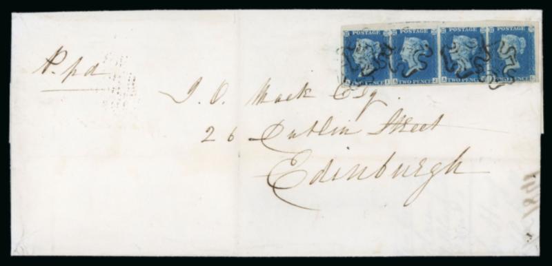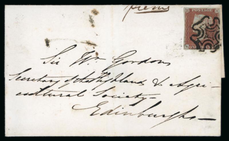 1840 (May 16) entire from Edinburgh (Scotland) to London bearing 1840 2d blue pl.1 TB, neatly tied by good strikes of the red Maltese cross, reverse with London arrival, a fresh and attractive and rare May date usage (S.G. £15'000).