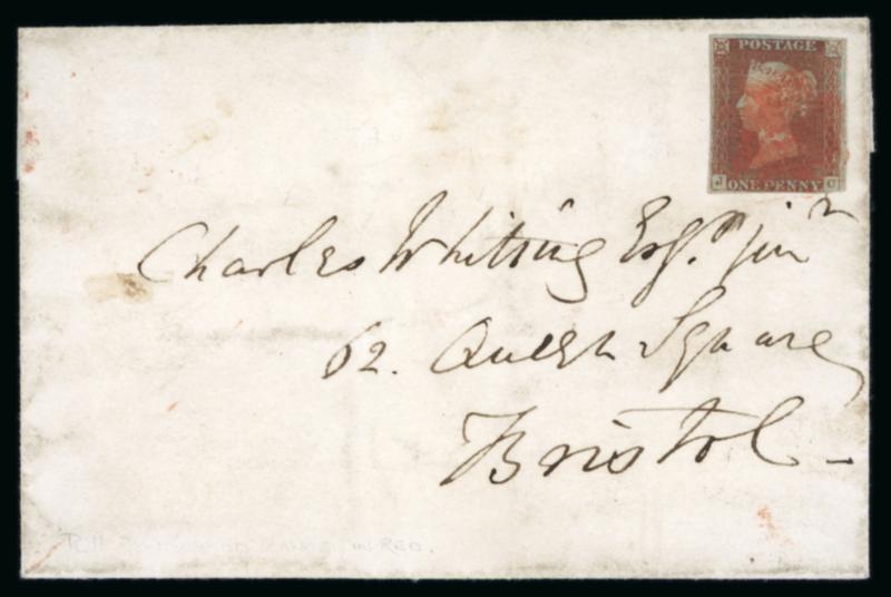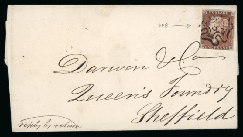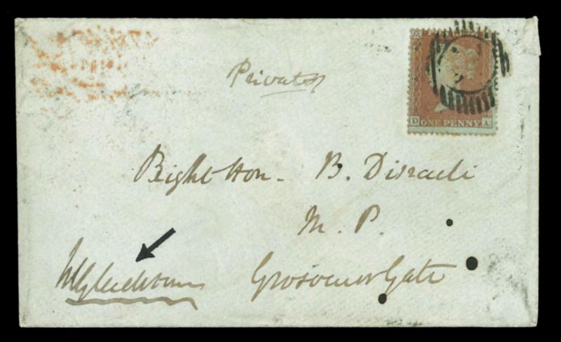 1853 (Mar 7) envelope from William Gladstone to Benjamin Disraeli, bearing 1d. red-brown, DA, Archer pl. 94, cancelled by number cancel; a superb, historical and very rare envelope. Ex Nigel Howard.