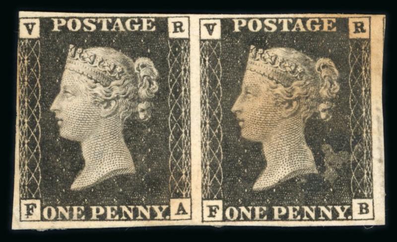 1840 1d black pl.1b in horizontal pair GK-GL with good margins and red MC (smudged). (S.G. Spec £1250).