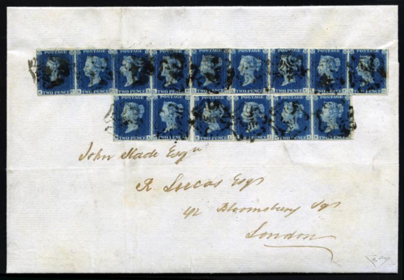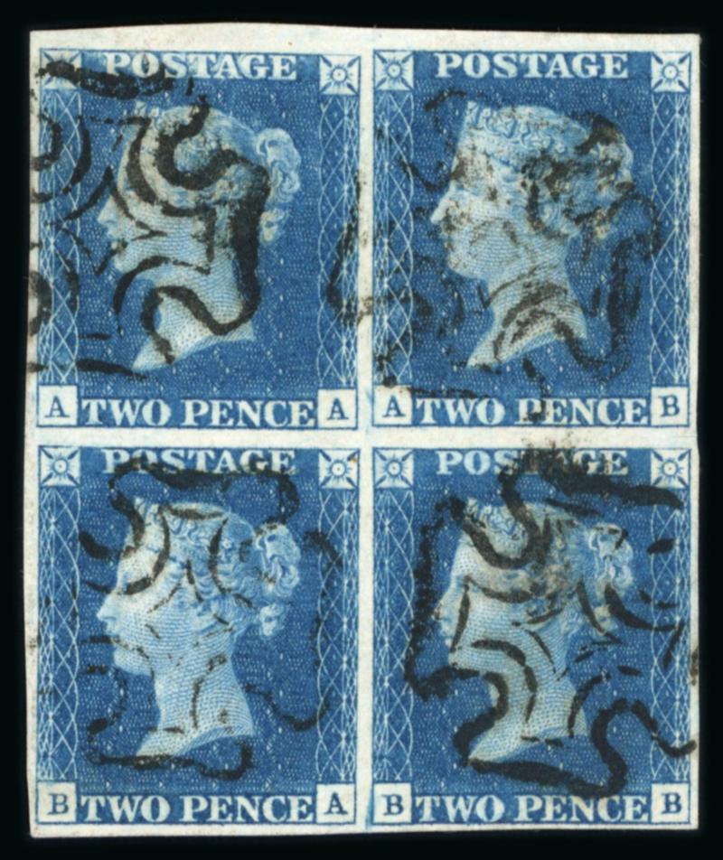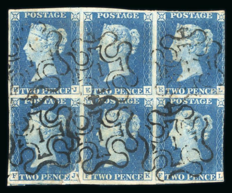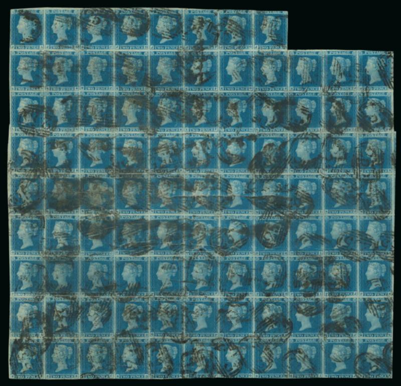 1841 2d. blue pl.3, JA-RK, irregular block of 96, cancelled by multiple strikes of the "255" 1844 type cancel of Doncaster; faults as to be expected of a multiple of this size, though a spectacular showpiece. very rare.