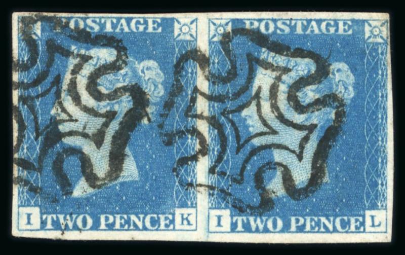 1840 2d deep blue pl.2 OE-OF in horizontal pair with good to large margins and two crisp strikes of black MC, shallow hinge thin and OE with small corner crease, a spectacular looking pair; cert. BPA (2024) and Brandon (2020) (S.G. Spec DS7, £2'500+).