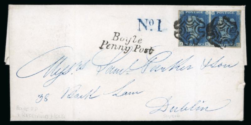 Larne: 1841 1d red-brown pl.33 RK with four large to very large margins on lettersheet from Larne to Dublin tied (just at left) by a superb strike of the very scarce Larne MC in dark green. Reverse with Larne cds in matching green and Dublin arrival, vertical filing fold affects the stamp, a fine co