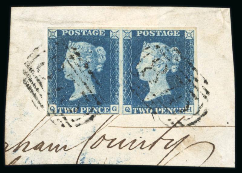 1840 2d deep blue pl.2 pair QG-QH, touched to good margins, horizontal pair tied on a fragment by 1844 type postmark, a very rare usage (SG D1xc, £4'000)