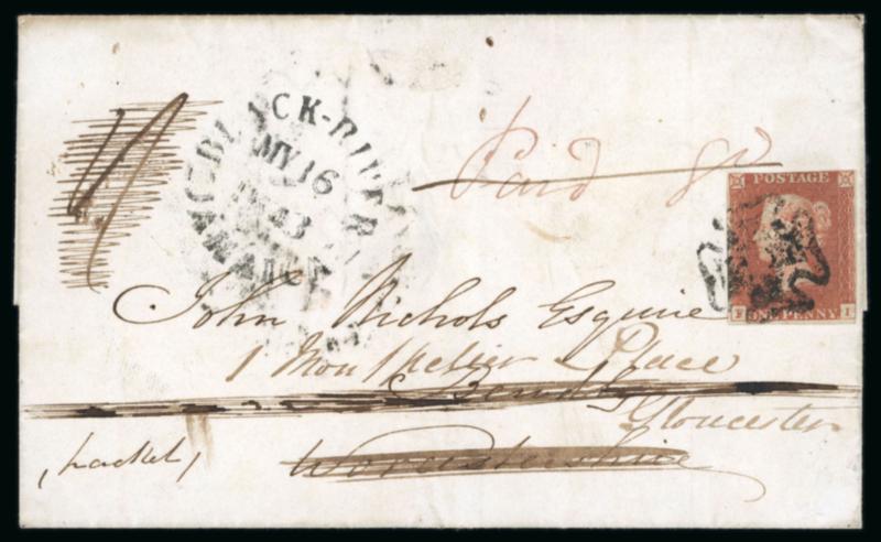1843 (May 16) entire letter from Jamaica via Worcester to Gloucester, bearing 1d. red brown, FI, Pl. 32, (cut into), paying a re-direction fee from Worcestershire, the front showing "BLACK RIVER JAMAICA" d.s. in black; unusual and scarce.