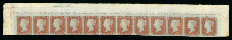 1841 1d. red, Pl. 94, AA-AL, mint complete row of twelve comprising the top of the sheet showing full marginal inscription and plate number, large part original gum: a few trivial faults as to be expected, though not affecting the fine appearance of this very rare multiple.