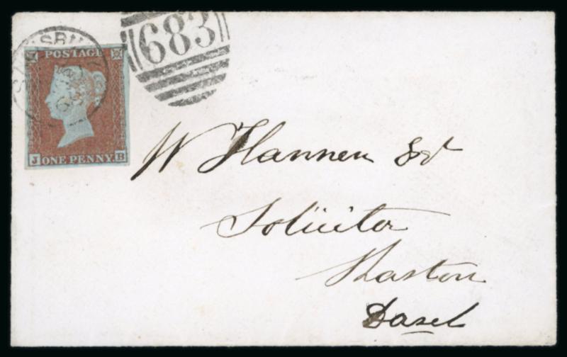 1868 (Mar 31) envelope from Salisbury, bearing 1852 1d. red-brown on very blued paper, JB, Pl. 157 (state 2 repair), placed at upper left (contrary to regulations), neatly tied by a very fine strike of the "683" duplex cancel, a scarce late usage and rare so fine in this quality; cert R.P.S. (2003).