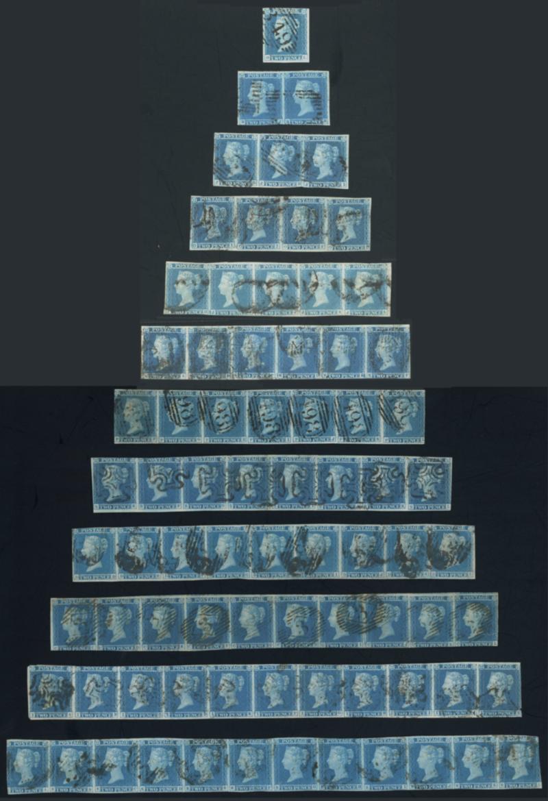 1841 2d blue used group in a "Christmas tree" shape, comprising a fine four margin single, followed by a pair, then strips of 3, 4, 5, 6, 7, 8, 9, 10, 11 and a complete row of 12. Margins touched in places, the strips of 8 and 10 have MC cancels, a wonderful and attractive group, very difficult to a