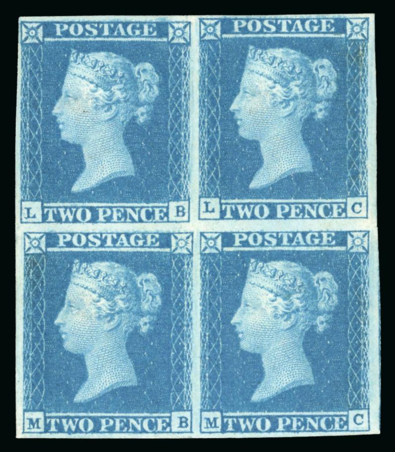 1841 2d blue pl. 3 LB/MC, a superb mint block of 4 with practically full original gum, superb and fresh colour, a very fine and attractive block of great rarity.