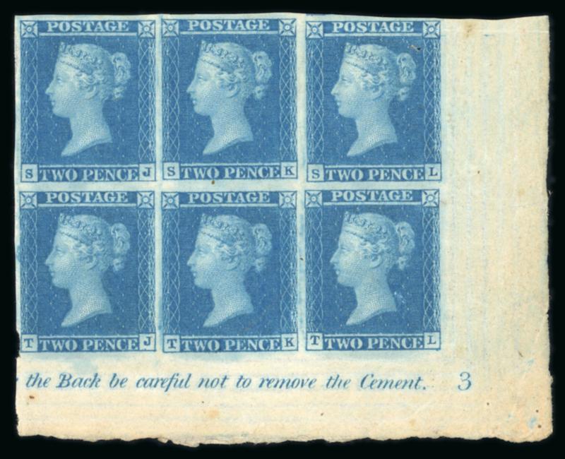 1841 2d blue pl.3 SJ-TL mint marginal inscriptional block of six from the lower right of the sheet with full deckle edge, showing part inscription "the Back be careful not to remove the Cement" and additionally showing the plate number "3", large part original gum; some wrinkling or faults with a s