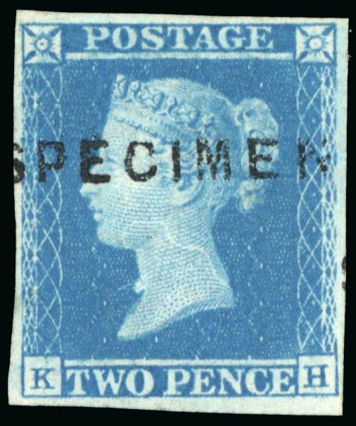 1841 2d blue pl.4 KH overprinted "SPECIMEN" type 1, with four good to large margins, mint part o.g., small printing flaw on Queen's neck, small surface scrape, still a fine example and very rare example of the specimen overprint on plate 4; cert. BPA (2012) and Provenance Certificate Karl Louis (20