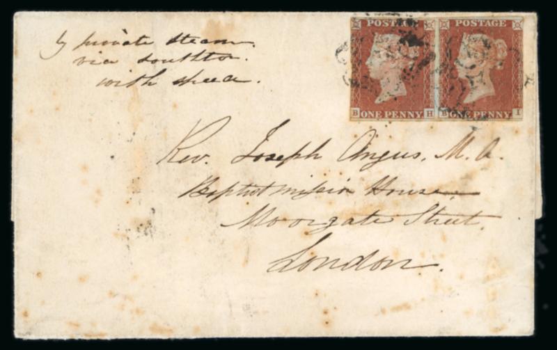 Channel Islands: 1844 (Jun 13) envelope from the Channel Islands to London with 1841 1d red-brown pl.41 BH-BI horizontal pair, margins close or touched at sides, tied by two strikes of the very scarce black MC of the Channel Islands, reverse with "SOUTHAMPTON / SHIP-LETTER" and London arrival, some