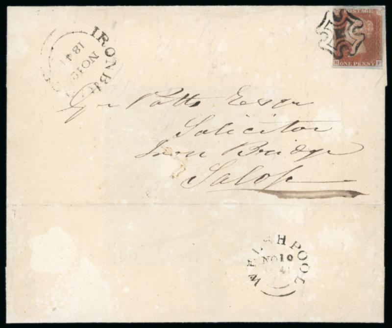 Welshpool: 1841 (Nov 10) wrapper from Welshpool (Wales) to Iron Bridge, with 1841 1d red, clear to very good margins, tied by a superb strike of the Welshpool distinctive "solid centre" Maltese Cross, with despatch on backflap which opens nicely to display, and arrival on obverse, small tear in addr