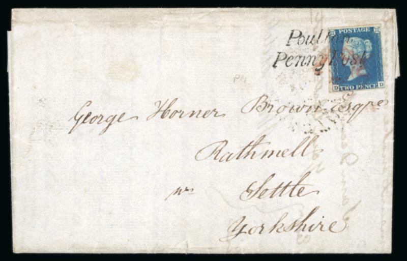 Poulton: 1841 (Jan 21) entire letter from Poulton to Settle, bearing 1840 2d blue pl.1 DD tied by red Maltese cross and a superb strike of the "Poulton/Penny Post" in black; a superb and very rare cover.