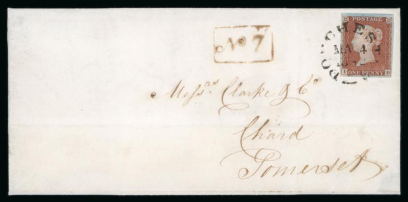 Dorchester: 1842 (Mar 4) Entire letter from Dorchester to Sommerset, bearing 1841 1d. neatly tied by a fine strike of the "Dorchester" town cancellation with boxed NO 7 alongside in red; rare.