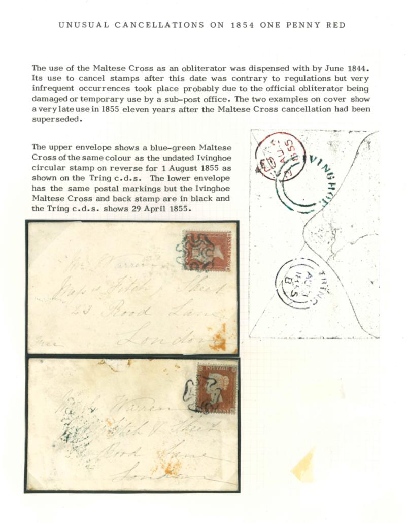 1855 late use of the Blue Maltese cross and Black Maltese cross of Ivinghoe, on a matched pair of covers to London bearing 1d. red browns; very rare. Cert Mike Jackson for each (2019). Ex Maximus (S.G. Spec. C1tb, C4tb).