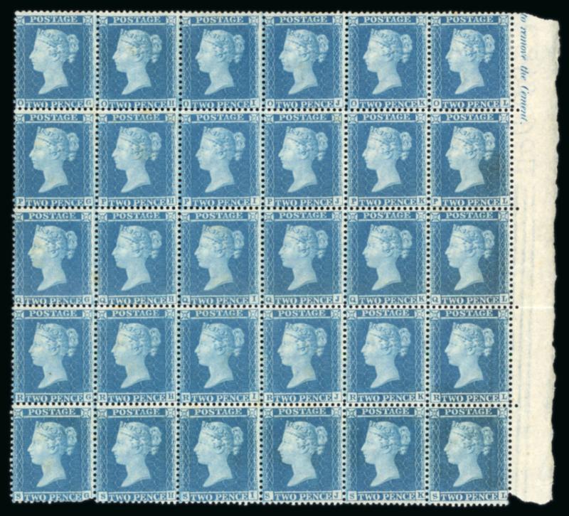 1854-57 2d blue pl.5 OG/SL mint marginal block of 30 from the right of the sheet with part inscription, very fresh, large part o.g., a couple of tone spots and SG defective at lower right, not detracting from the fine appearance of this superb and very scarce multiple; cert BPA (1983); ex Sir Gawain