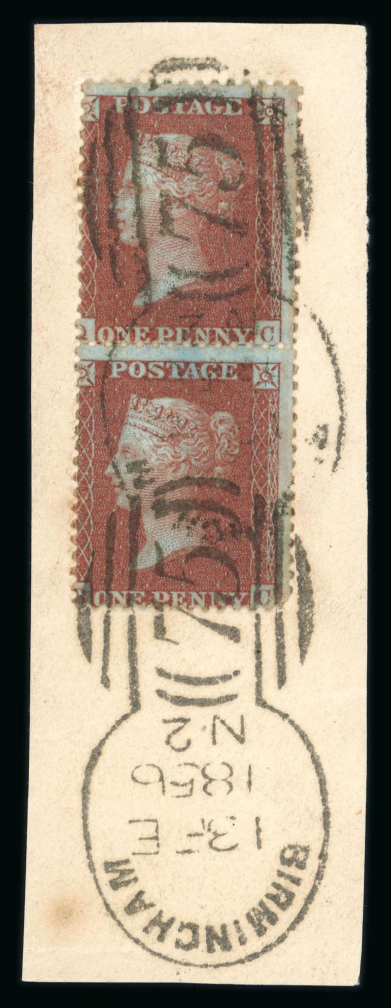 1855 1d. deep red-brown, QC-RC, Pl. 25 vertical pair, now hinged to original piece from which it was tied by a superb strike of the Birmingham "Spoon" cancel dated 13.02.56; excellent fresh colour and a rare plate. Cert B.P.A (2005) (S.G. Spec. C7).
