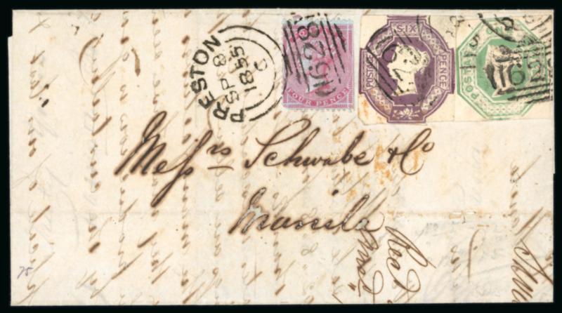1855 (Sep 8) wrapper from Preston to Manilla in the Philippines, franked with Embossed 6d and 1s, with margins just about clear except for small nick on 6d, and 1855-57 4d on blued paper (trimmed wing marginal), reverse with London and Hong Kong transit, some minor cover imperfections with some ink