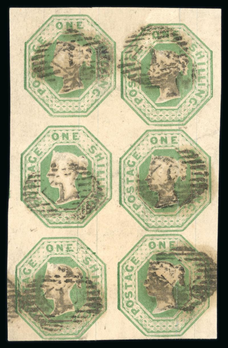 1847-54 1s green die II in used block of 6 with London numeral cancels, good to large margins all round and in remarkably fine condition for a multiple of this size, a very scarce multiple.